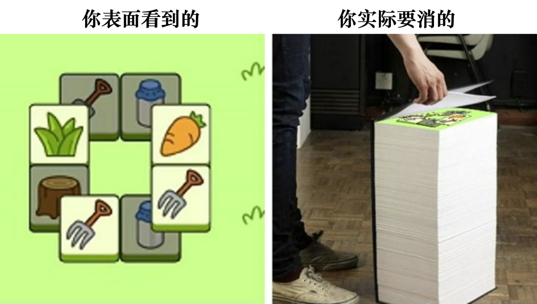 第二關(guān)一共有200張卡片,一般來說有13種類型,假設(shè)第二關(guān)的每張卡片和布局都是隨機(jī)生成的,當(dāng)你玩的越往后,越是會出現(xiàn)總是三缺一的情況,你能看到的牌,和你槽里的牌,一定是不一樣的。